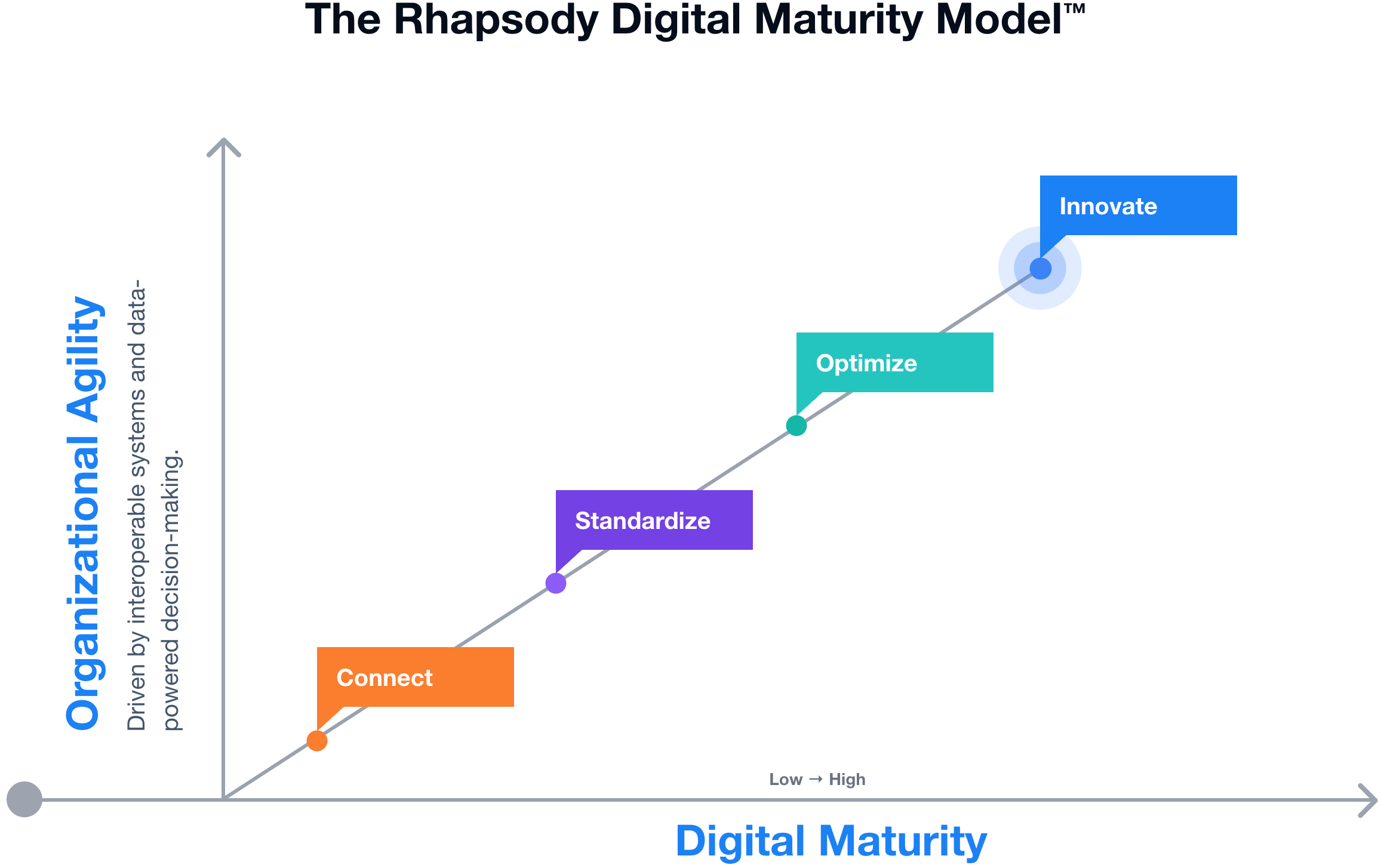 The Rhapsody Digital Maturity Model™ is a research-backed framework that maps your organization's path from basic connectivity to enterprise-wide AI adoption.